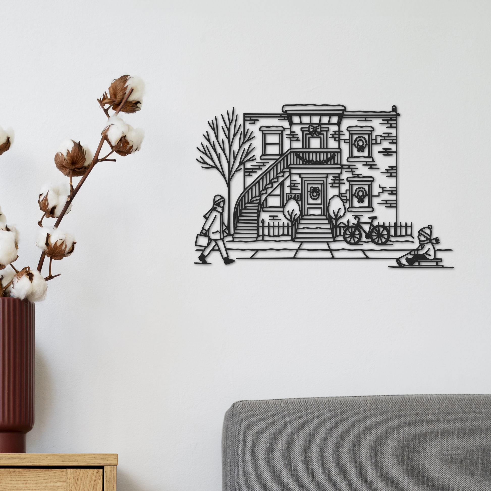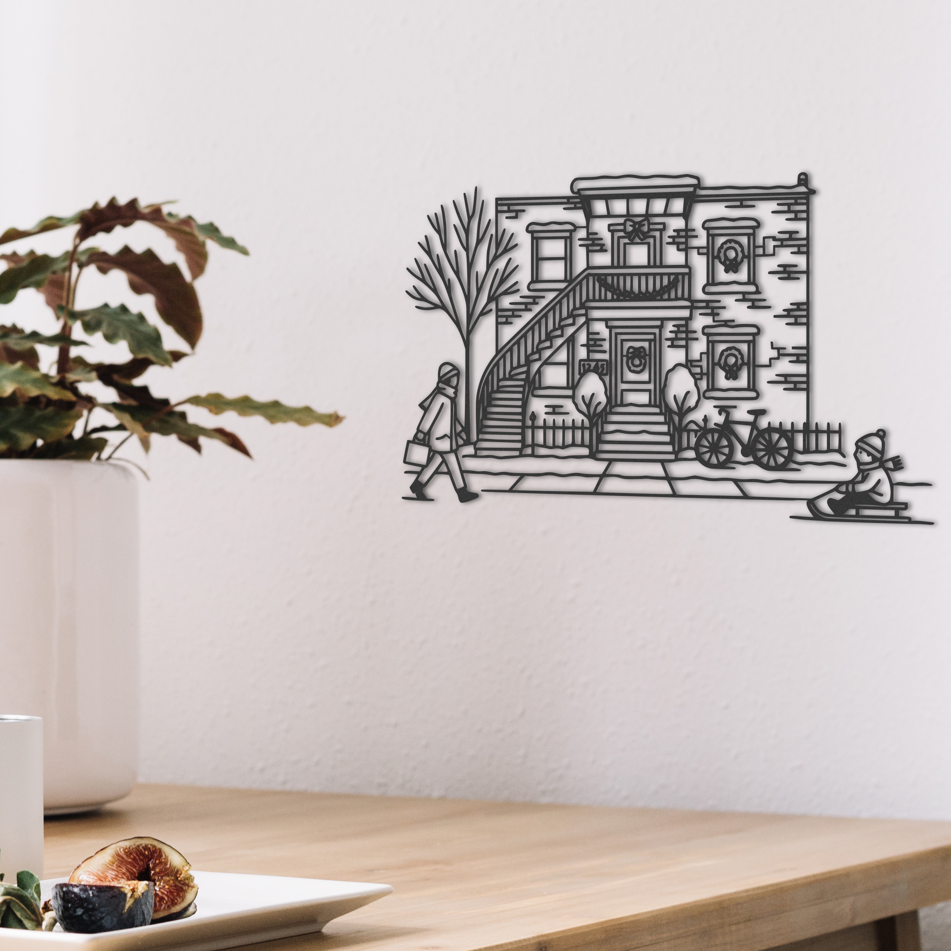 En version hivernale, la scène prend un charme encore plus authentique : un passant en tuque, un enfant en traîneau, un trottoir enneigé… l’essence même de la vie quotidienne dans les quartiers montréalais.
