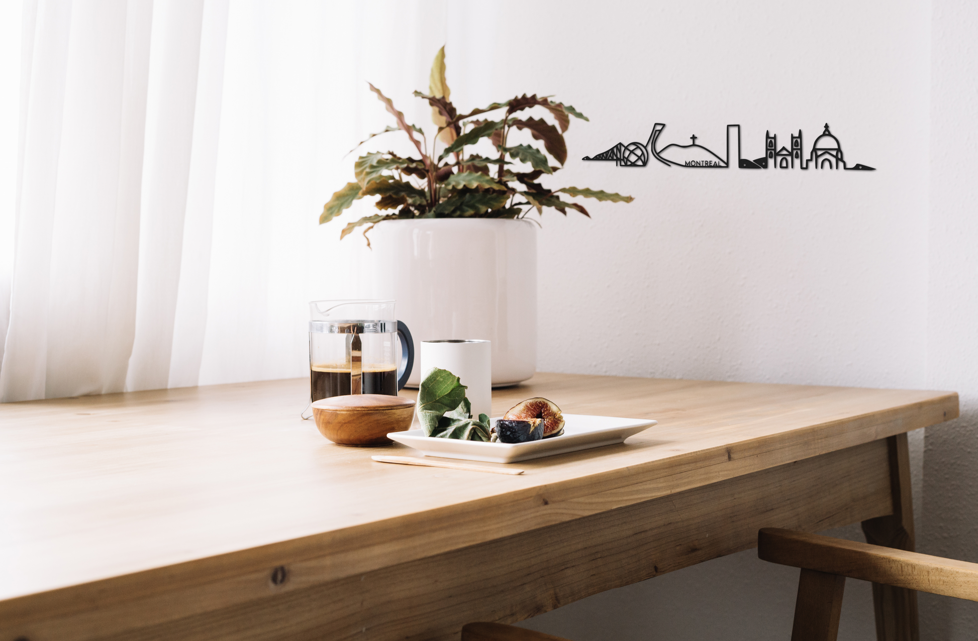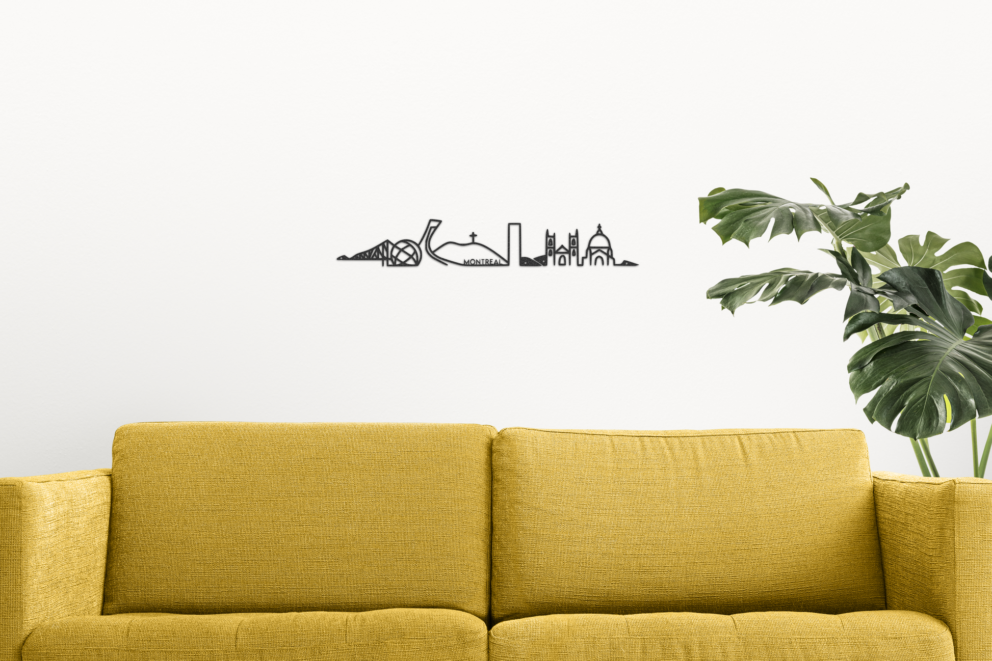 Cette décoration murale de la skyline de Montréal rassemble, dans un design épuré, les symboles les plus emblématiques de la ville : le Pont Jacques-Cartier, la Biosphère, le Stade Olympique, le Mont-Royal, Notre-Dame et l’Oratoire Saint-Joseph.